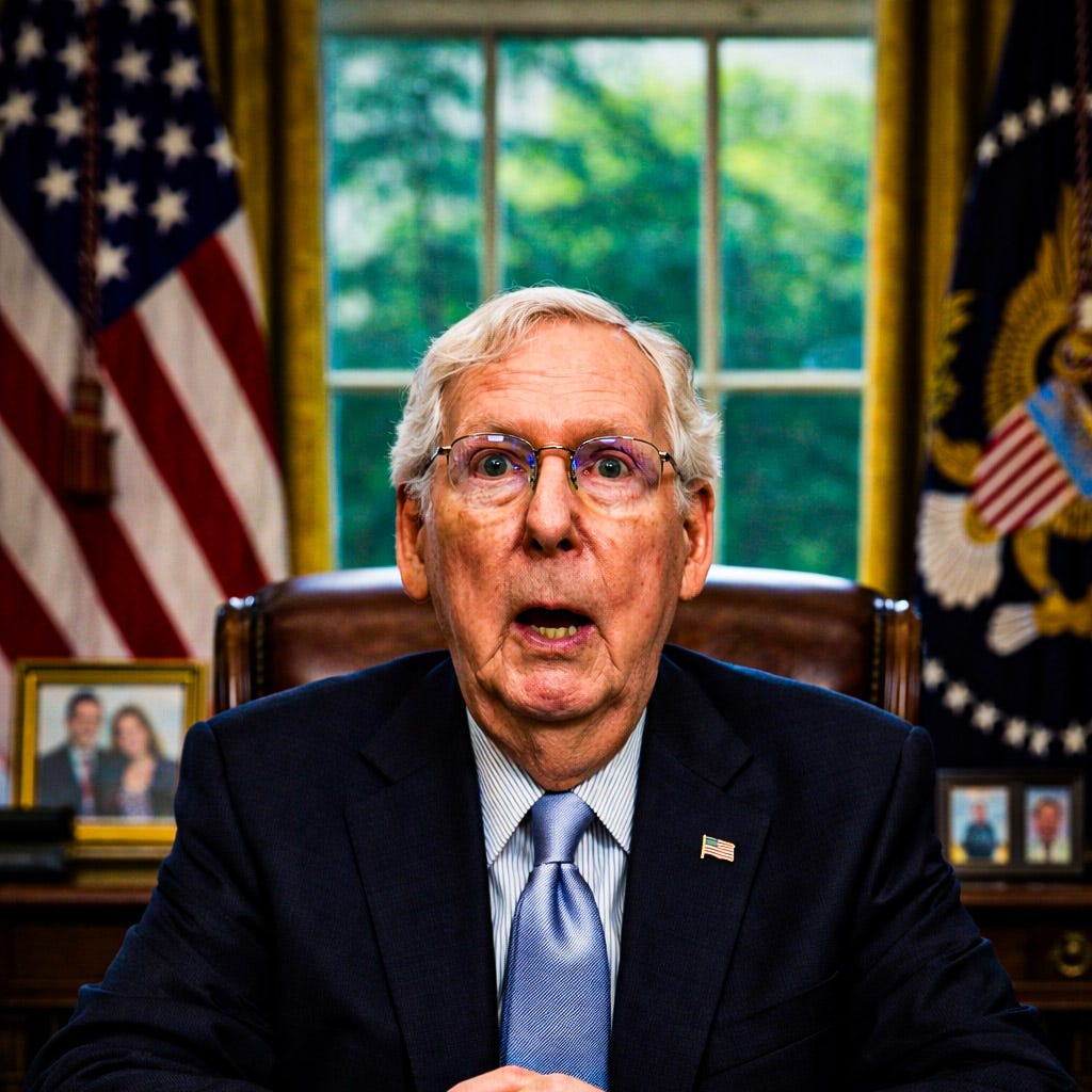 To normal people, the ancient McConnell looks frozen. He stops talking for no apparent reason. He stares blankly. He sometimes completely powers down in public. He’s about 300 years old, and even more senile than Trump, though not as freaking crazy, which makes him easy to control—and to “alter with state-of-the-art computers and electronics,” Larry Ellison suggested. “It’s the 21st Century, after all.”